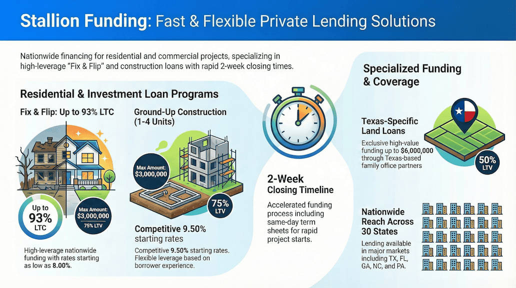 Stallion Funding’s footprint is strategically diverse, covering a massive swath of the U.S. from the East Coast to the Great Plains. Their programs cater to the three pillars of modern real estate investment: Fix & Flip, Ground-Up Construction, and Bridge Financing.
